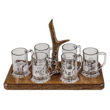 Avec 6 verres à anse de 6 cm de haut sur une planche en chêne avec une bois de chevreuil.
