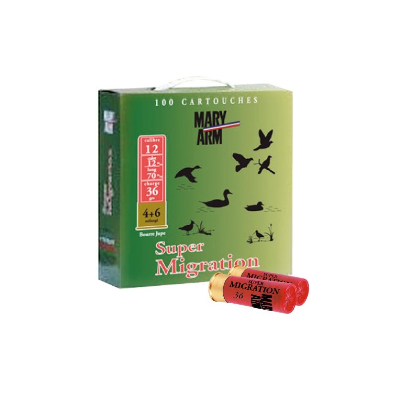 Une boite contenant 100 cartouches Migration 36 en calibre 12. Ces munitions sont très appréciés des chasseurs pour sa polyvalence; Avec la Migration 36, vous pouvez pratiquer la chasse de plusieurs types de gibiers grâce à sa variété de plombs : un mélange de 36g de plomb en 4+6 ou 7,5+9.